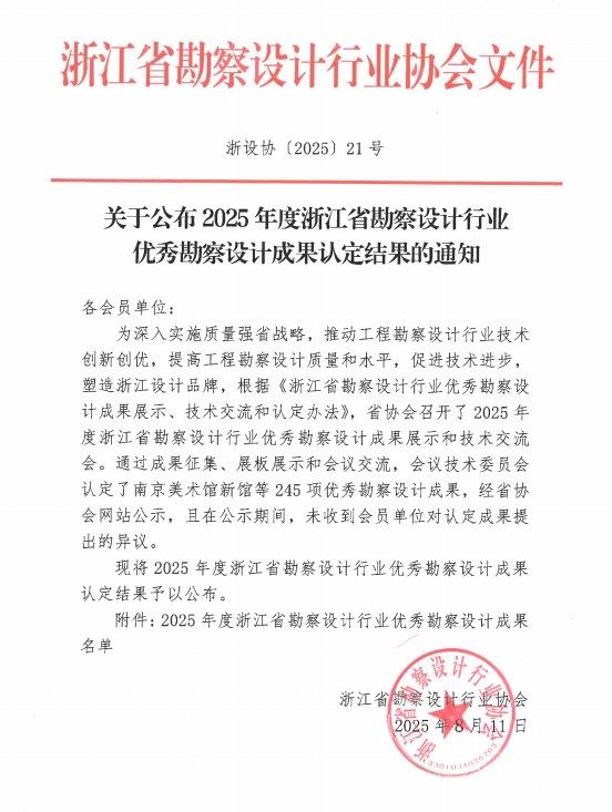發(fā)布日期:2025.08.26 近日,2025年度浙江省勘察設(shè)計行業(yè)優(yōu)秀勘察設(shè)計成果評選結(jié)果正式公布。由我院牽頭設(shè)計的“奉化江堤防整治工程鄞奉交界段”項目,繼榮獲寧波市優(yōu)秀勘察設(shè)計獎之... -