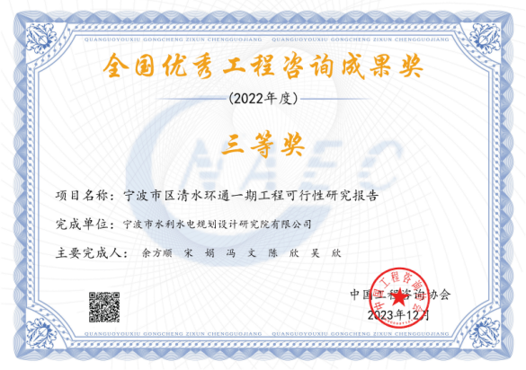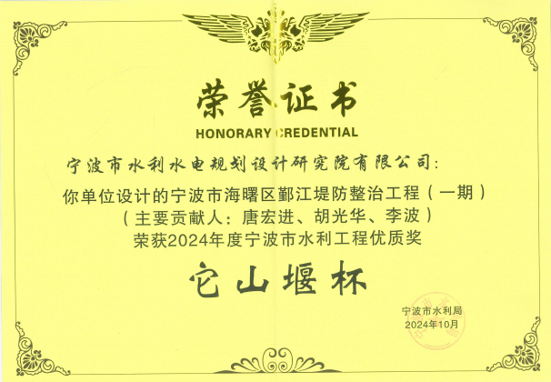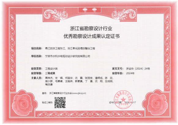 在工程項(xiàng)目方面,獲得2022年度全國優(yōu)秀工程咨詢成果獎(jiǎng)、2024年度寧波市優(yōu)秀勘察設(shè)計(jì)獎(jiǎng)、2024年浙江省勘察設(shè)計(jì)行業(yè)優(yōu)秀勘察設(shè)計(jì)”綜合類成果獎(jiǎng)、寧波市優(yōu)秀水利工程設(shè)計(jì)二等獎(jiǎng)、“浙江省文明標(biāo)化工地”稱號(hào)、“2024年度寧波軌道交通市域鐵路工程立功競賽先進(jìn)集體”等各類獎(jiǎng)項(xiàng)十余項(xiàng)。