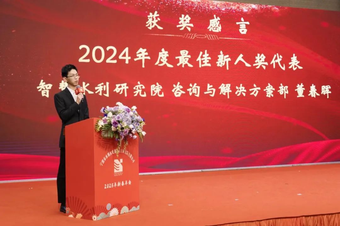 2024年度先進(jìn)工作者獲獎代表工程院機(jī)電所的邵煜、2024年度最佳奉獻(xiàn)獎獲獎?wù)呔C合部的陳曉鳴、2024年度最佳新人獎獲獎代表智慧水利研究院咨詢與解決方案部的董春暉,先后上臺發(fā)表獲獎感言。