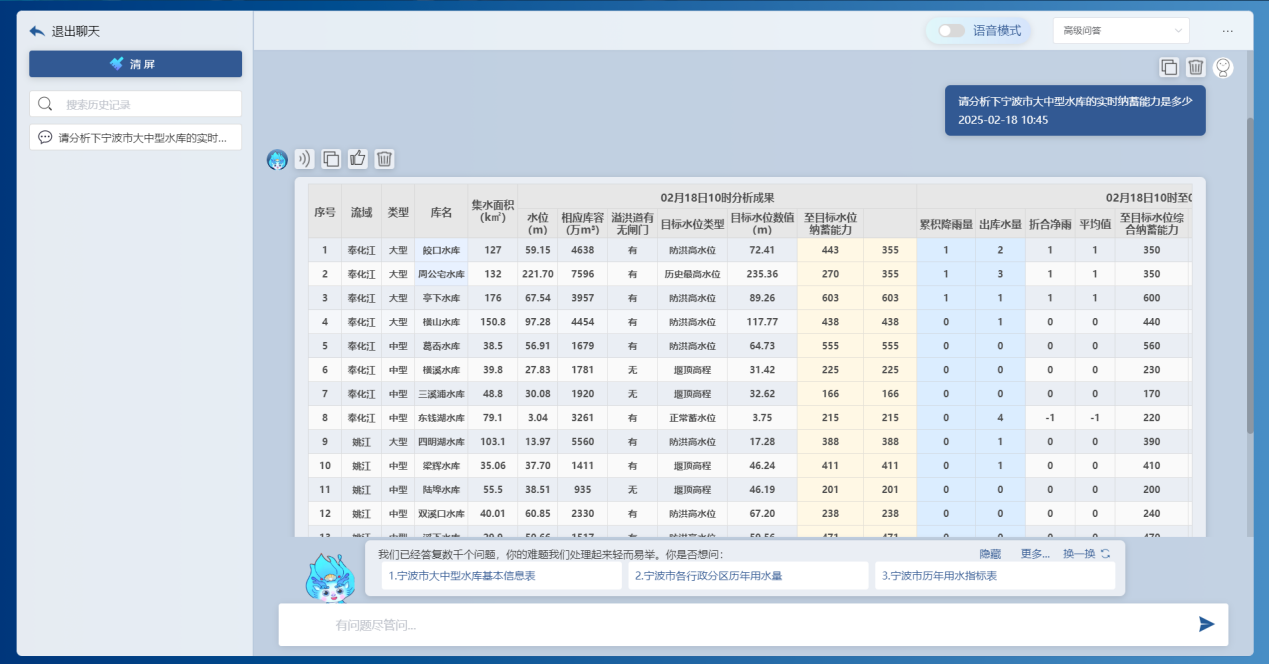 基于前端感知的降雨、水位、流量、工程運(yùn)行等實(shí)時(shí)信息,借助DeepSeek大模型和“甬水院智算”算法庫,能夠?qū)崟r(shí)對(duì)流域防汛形勢(shì)進(jìn)行快速分析,包括降雨形勢(shì)、水情預(yù)警、預(yù)泄分析、水庫納蓄分析等,可以按照規(guī)定的表單形式一鍵輸出成果,為防汛防洪工作提供兼具前瞻性、科學(xué)性、精準(zhǔn)性、安全性的決策支撐。相關(guān)學(xué)術(shù)成果曾以《基于大模型的水利防汛智能問答關(guān)鍵技術(shù)研究與應(yīng)用探索》為題于去年8月的第七屆城市水安全與水管理學(xué)術(shù)交流會(huì)作專題匯報(bào)。