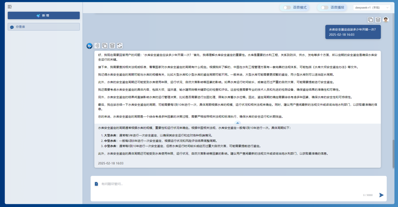基于本地部署的DeepSeek-r1模型和私域知識(shí)庫,通過該工具能夠?qū)崿F(xiàn)對(duì)水利行業(yè)的水旱災(zāi)害防御、水資源管理、水工程管理、水生態(tài)保護(hù)等各領(lǐng)域知識(shí)的高效檢索問答,節(jié)省大量查閱資料的時(shí)間,提高工作效率。