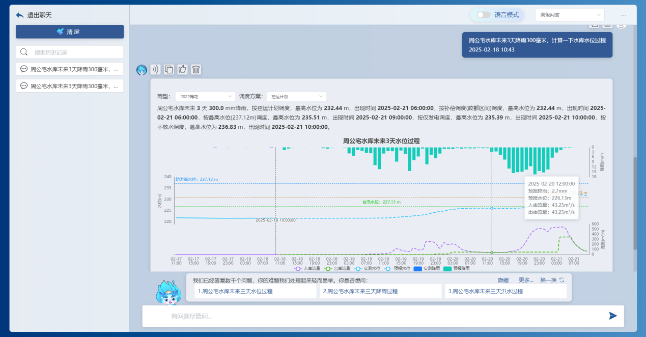 通過“澤圖水文水動(dòng)力一體化模型平臺(tái)”與DeepSeek大模型耦合應(yīng)用的初步探索,可實(shí)現(xiàn)對(duì)話語義解析、自動(dòng)匹配調(diào)用水利專業(yè)模型并輸出成果,極大豐富了分析計(jì)算、預(yù)測預(yù)報(bào)類業(yè)務(wù)應(yīng)用場景,簡化了應(yīng)用流程。
