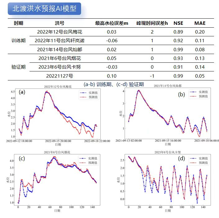 利用成熟水利專業(yè)模型模擬計(jì)算不同降雨潮位邊界條件下的洪水過程數(shù)據(jù),再基于DeepSeek對(duì)海量洪水模擬數(shù)據(jù)成果進(jìn)行模型訓(xùn)練和蒸餾。目前我院已對(duì)北渡、鎮(zhèn)海等重要流域控制站點(diǎn)進(jìn)行了AI洪水預(yù)報(bào)模型訓(xùn)練和精度驗(yàn)證,結(jié)果表明AI洪水預(yù)報(bào)的準(zhǔn)確性不輸傳統(tǒng)水利專業(yè)模型。