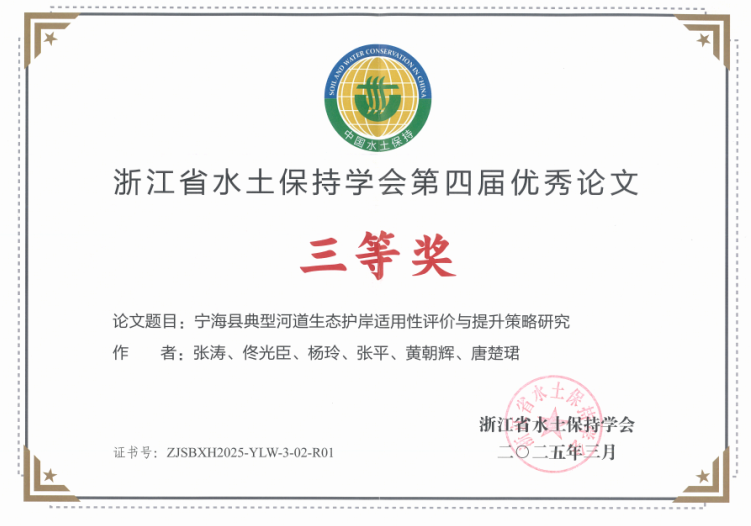 會議現(xiàn)場通報了2024年度生產(chǎn)建設項目水土保持方案優(yōu)秀單位、2024年度生產(chǎn)建設項目水土保持監(jiān)測優(yōu)秀單位,并為獲獎集體進行表彰。隨后,又現(xiàn)場表彰了浙江省水土保持學會第四屆優(yōu)秀論文評選結(jié)果。我院榮獲2024年度生產(chǎn)建設項目水土保持方案優(yōu)秀單位、2024年度生產(chǎn)建設項目水土保持監(jiān)測優(yōu)秀單位兩項集體榮譽,并且以論文《寧??h典型河道生態(tài)護岸適用性評價與提升策略研究》獲得浙江省水土保持學會第四屆優(yōu)秀論文三等獎。