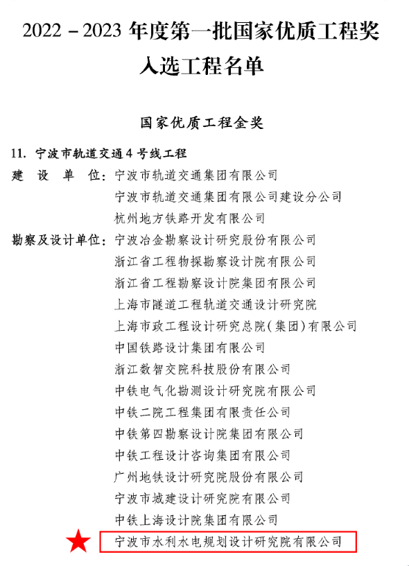 喜訊!我院參與設(shè)計(jì)的寧波軌道交通4號線工程榮獲國家優(yōu)質(zhì)工程金獎(jiǎng)