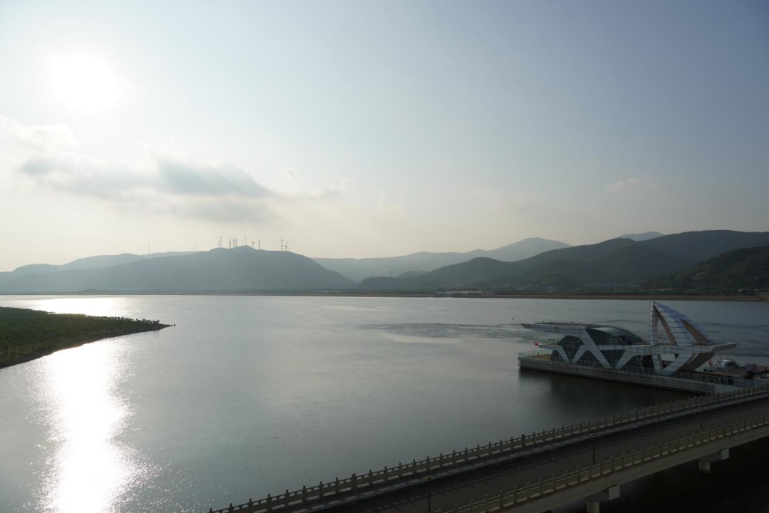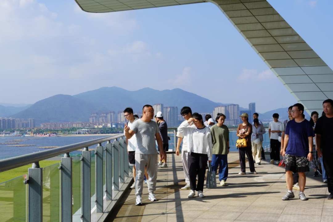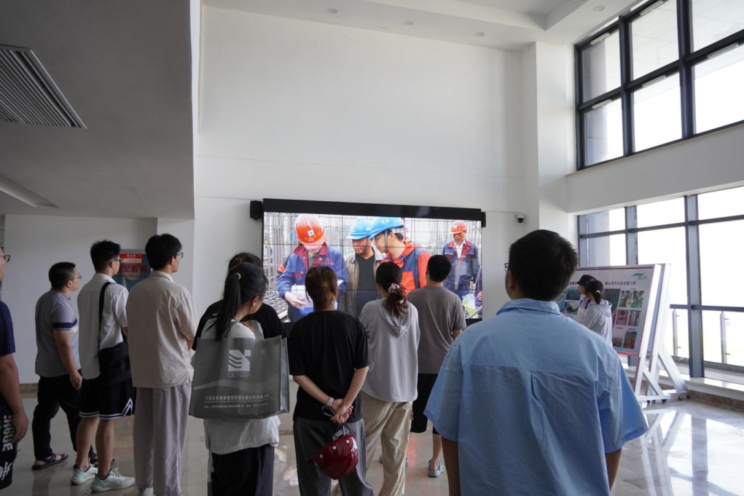 梅山灣外,銀浪拍岸;梅山灣內(nèi),碧波含翠。首先,研學(xué)隊伍到達(dá)梅山灣建設(shè)管理中心,跟隨工作人員登樓參觀,眺望南堤樞紐及附近設(shè)施,聆聽工程總體建設(shè)情況,并觀看宣傳片,了解該工程的誕生始末。