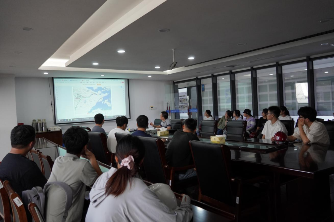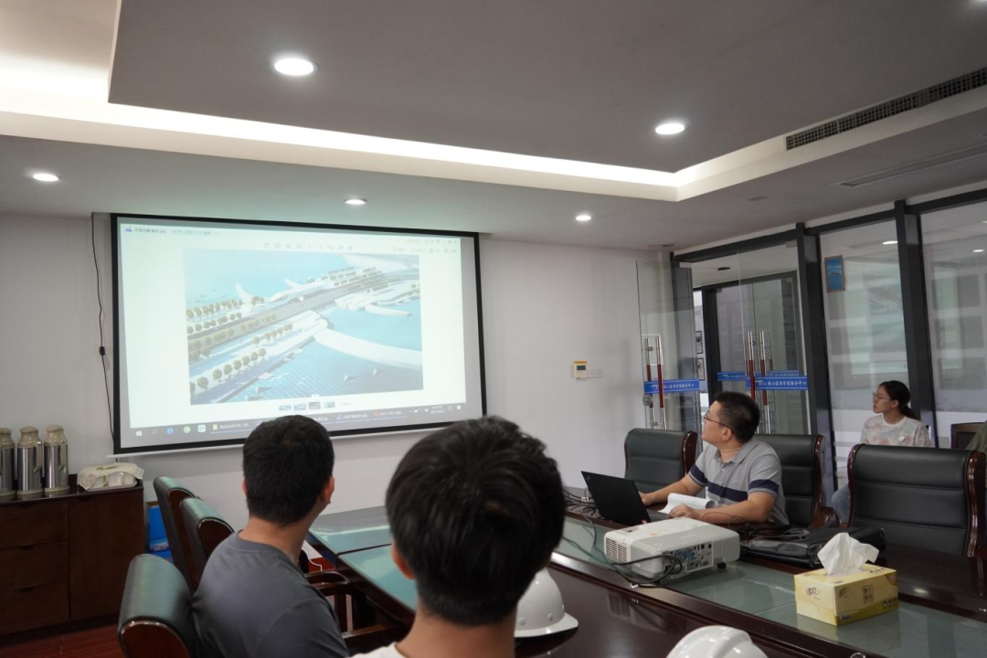 接著,研學(xué)隊伍來到會議室,胡經(jīng)理結(jié)合建設(shè)目標(biāo)、工程建設(shè)客觀因素、工程效益和景觀效果,詳細(xì)講解設(shè)計思路、問題對策和創(chuàng)新點,為大家上了一堂嚴(yán)謹(jǐn)生動的復(fù)盤課。比如海堤采用緩坡入海,外側(cè)采用異形結(jié)構(gòu)塊消浪,內(nèi)坡采用生態(tài)水工磚美化,使海堤具備結(jié)構(gòu)和生態(tài)景觀雙重效果;船閘與海堤銜接段軟土處理采用新型技術(shù)應(yīng)用——樁網(wǎng)復(fù)合地基,形成“樁-網(wǎng)-土”協(xié)同工作共同承載的復(fù)合工藝。在座職工認(rèn)真聆聽梅山灣如何從曾經(jīng)的“漲潮黃沙水,落潮滿目泥”到如今的“水清、岸綠、波寧、潮平”,受益匪淺。