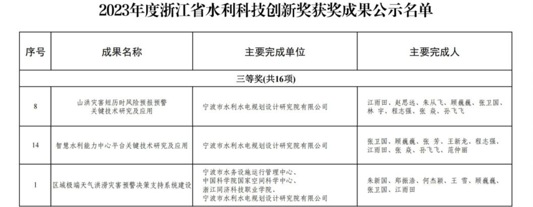 近日,浙江省水利廳公布2023年度浙江省水利科技創(chuàng)新獎(jiǎng)獲獎(jiǎng)名單,寧波市水利院申報(bào)的3項(xiàng)成果順利通過(guò)公示,榮獲浙江省水利科技創(chuàng)新獎(jiǎng)三等獎(jiǎng)!